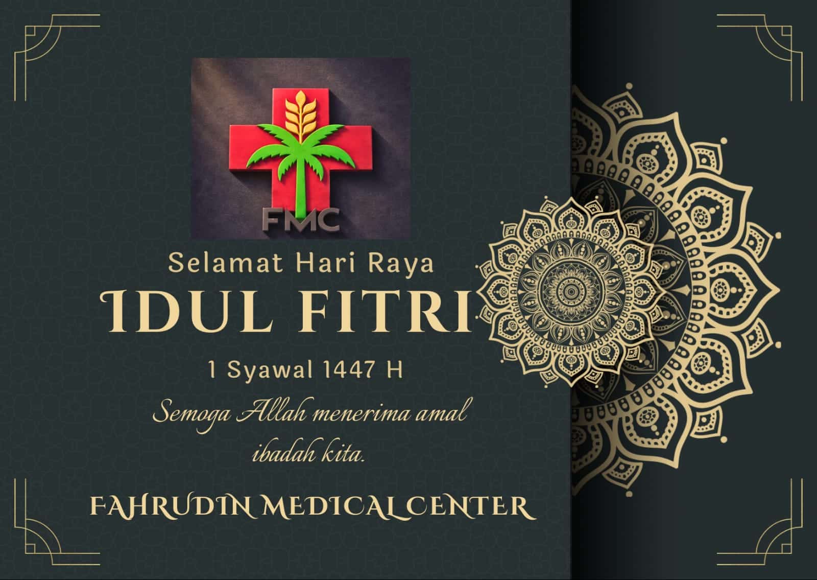 Logo tersebut ditampilkan dalam desain ucapan Idul Fitri 1447 H yang elegan, dengan sentuhan ornamen islami berwarna emas. Menurut dr. Bahrudin, momentum Hari Raya dimanfaatkan sebagai sarana memperkenalkan identitas klinik kepada masyarakat luas.